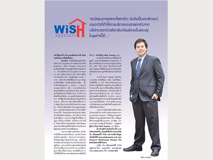 “นอกจากเตรียมพร้อมรับมือกับ AEC เป้าหมายต่อไป เราจะมีการพัฒนาช่องทางการขายและบุคลากรของเราซึ่งมีคุณภาพอยู่แล้วให้มีคุณภาพและเป็นมืออาชีพมากขึ้น เพื่อดูแลให้ครอบคลุมพื้นที่ในกรุงเทพฯ มากที่สุดและสามารถตอบโจทย์ลูกค้าได้ทุกโซน”กรรมการผู้จัดการใหญ่ Wish Property กล่าวทิ้งท้าย