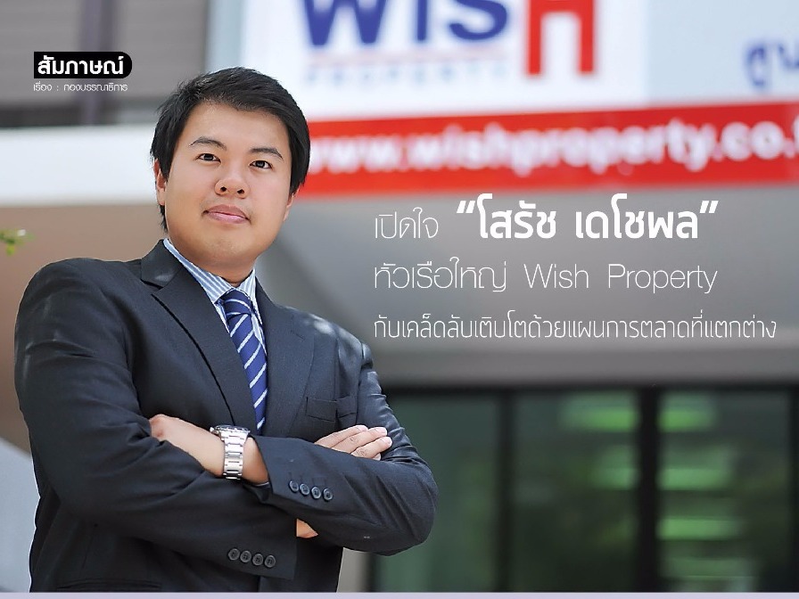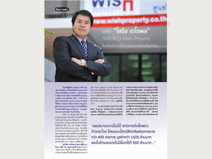 ส่วนปัจจัยที่ส่งผลสำเร็จทำให้ Wish Property เติบโตแบบก้าวกระโดดนั้น คุณโสรัช ให้เหตุผลว่า “เรามีแผนการตลาดที่แตกต่าง อันถือเป็นเอกลักษณ์เฉพาะตัวที่ทำให้การบริการของเราแตกต่างจากบริษัทนายหน้าอสังหาริมทรัพย์รายอื่นและอยู่ในธุรกิจนี้ได้ โดยเรามีเทคนิคการลงประกาศขายสินทรัพย์ผ่านเว็บไซต์ ซึ่งสามารถค้นหาจาก Google ขึ้นเป็นอันดับหนึ่งหรืออันดับต้นๆ ได้ นอกจากนั้นเรายังเน้นให้บริการแบบซื่อสัตย์ สุจริต ไม่มีการบวกราคาขายเกินจริงเพื่อกินส่วนต่าง และเราก็ให้บริการด้วยพนักงาน Full time ทำงานแบบเต็มเวลาทุกวันเพื่อให้บริการลูกค้าได้อย่างเต็มที่ เพราะคอนเซ็ปต์ของเราคือ ‘ทุ่มเททุกนาทีเพื่อคุณ’ และเมื่อเรามีเอกลักษณ์เฉพาะตัว ก็ทำให้ลูกค้าไว้วางใจและมีสินค้ามากขึ้น ซึ่งส่งผลถึงยอดขายที่เพิ่มขึ้นด้วย