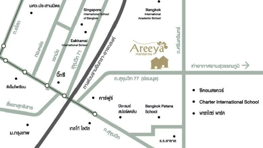 โครงการ อารียา แมนดารีนา ( Areeya Mandarina Village ) สุขุมวิท 77 ทาวน์เฮ้าส์/ทาวน์โฮม 3 ชั้น ทำเลดี ติดถนนใหญ่สุขุมวิท 77 (ใกล้ซอยอ่อนนุช 39) สามารถเข้า-ออก ได้หลายเส้นทาง เช่น ถนนสุขุมวิท, ถนนศรีนครินทร์, ถนนพัฒนาการ และถนนอุดมสุข มีทางด่วนได้หลายเส้นทาง เช่น ทางด่วนพระราม 9 ทางด่วนบูรพาวิถี (บางนา) ทางด่วนสุขุมวิท 50 ทางด่วนสุขุมวิท 62 และทางด่วนมอเตอร์เวย์ชลบุรี
