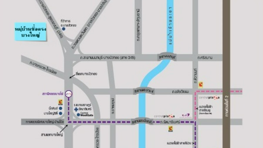 ทำเล : โครงการหมู่บ้านติดถนนใหญ่ (บางบัวทอง-340) ตรงข้ามที่ว่าการอำเภอบางบัวทอง เชื่อมต่อถนนกาญจนาภิเษก รัตนาธิเบศร์ ราชพฤกษ์เดินทางสู่แหล่งธุรกิจ ใจกลางเมือง สีลม-สาทร ได้ในเวลาอันรวดเร็ว ใกล้รถไฟฟ้าสายสีม่วง สถานีคลองบางไผ่ พร้อมด้วยอาคารจอดรถกว่า 1,800 คัน ทำเลดีใกล้ห้างและสถานศึกษา สถานตำรวจภูธรบางบัวทอง