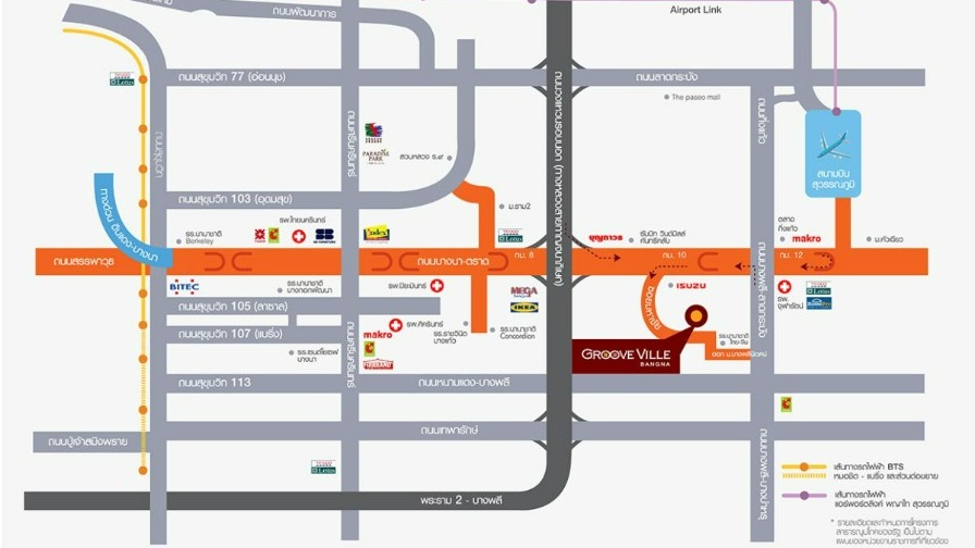 - ใกล้ห้างสรรพสินค้าเมกาบางนา, เซ็นทรัลบางนา, เซ็นทรัลวิลเลจ, แบงค็อกมอลล์, มาร์เก็ตวิลเลจสุวรรณภูมิ, โลตัสบางพลี, บิ๊กซีบางนา และแม็คโครบางพลี